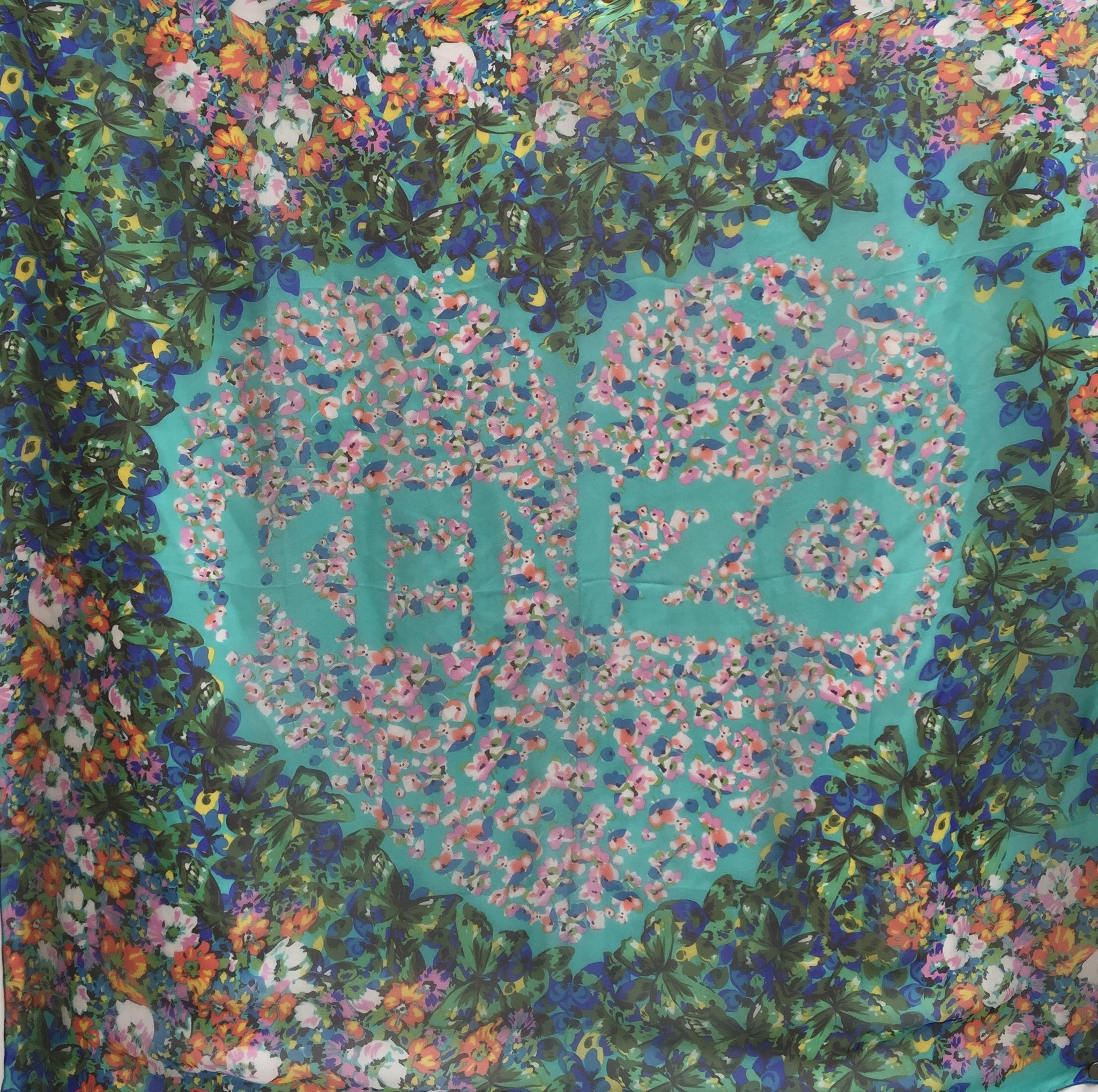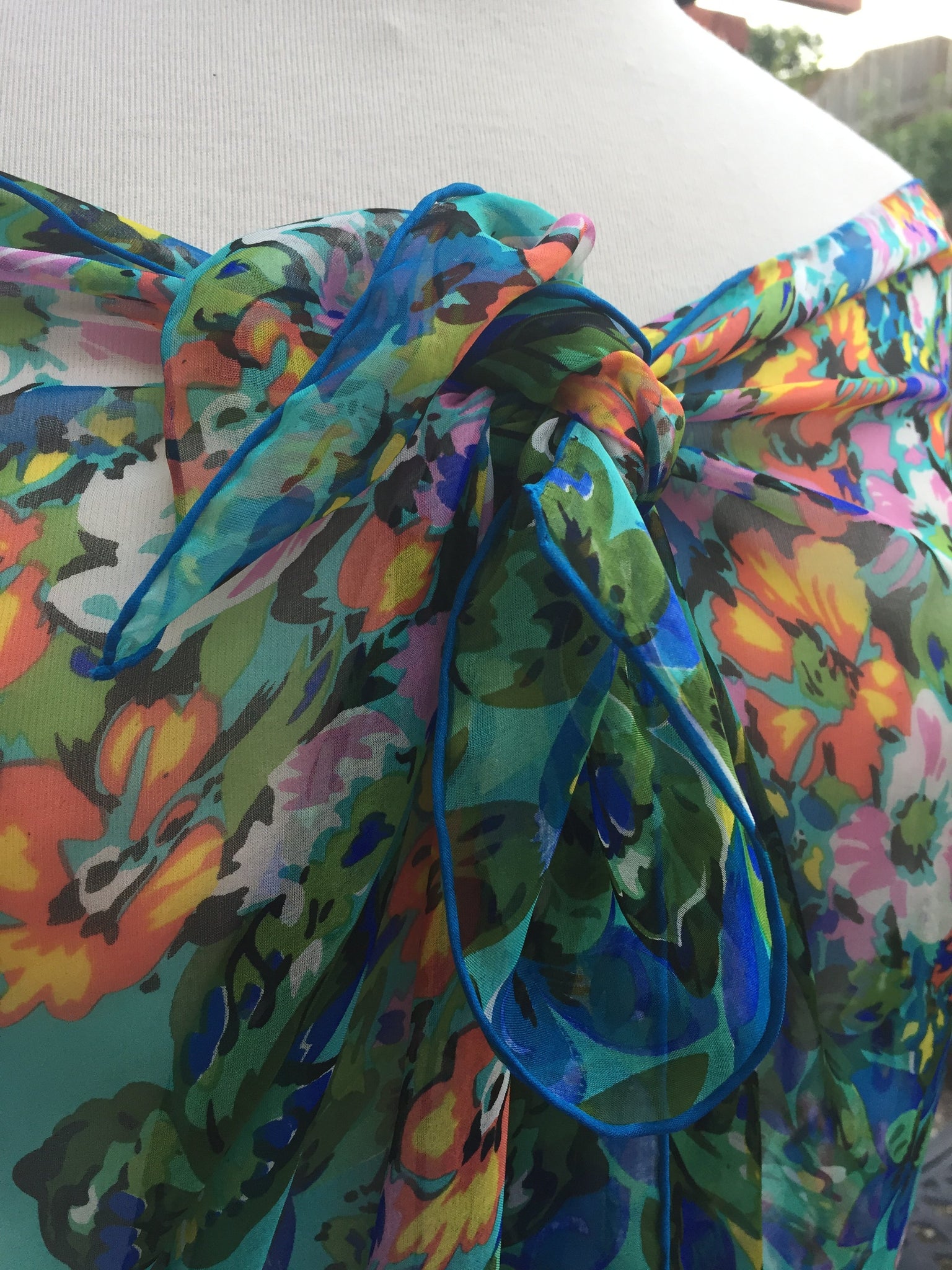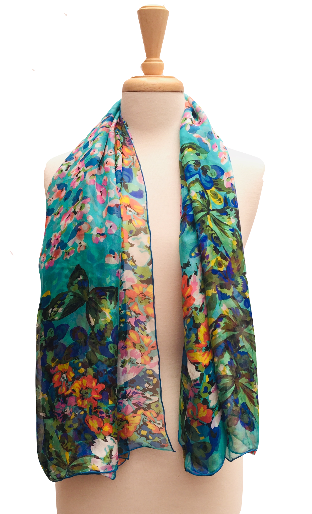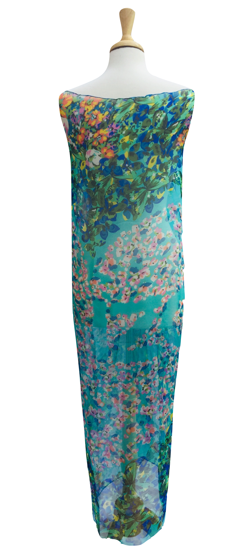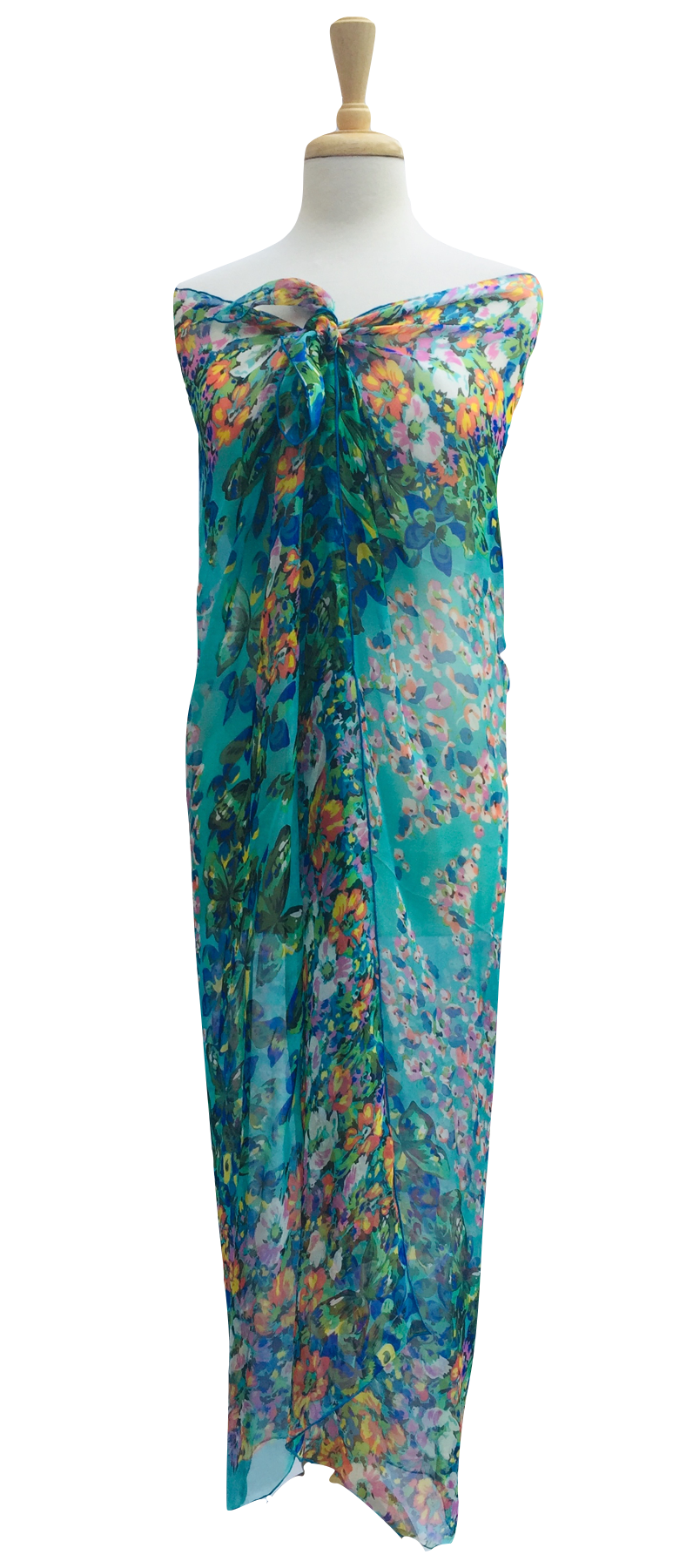 Long sheer scarf with floral print in turquoise. Can also be used as a swimsuit cover-up or shawl.
